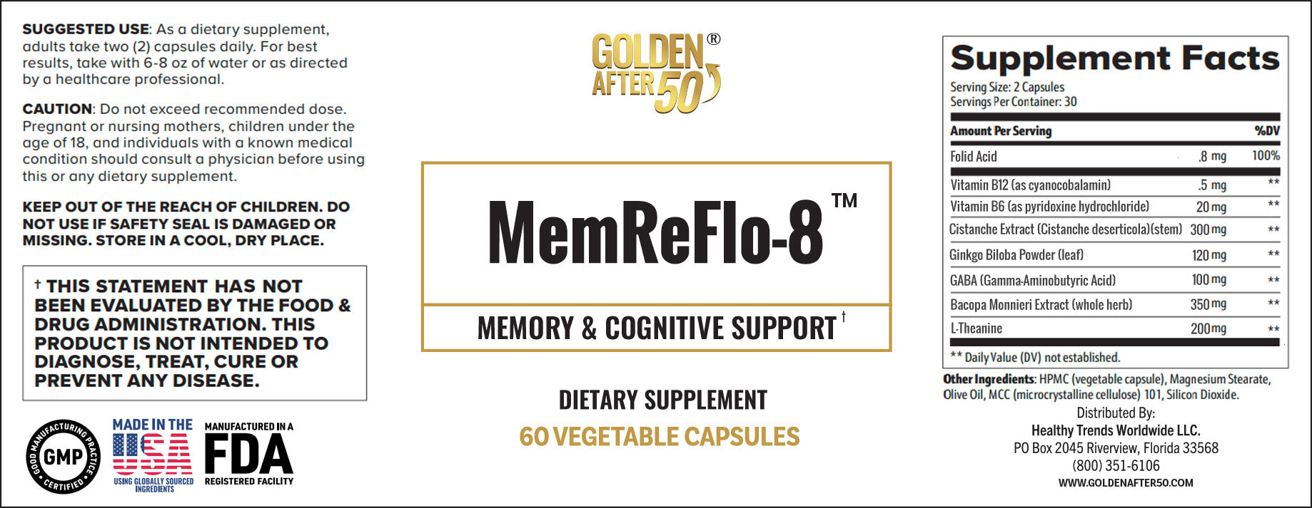 MemReFlo-8™ is a nutritional formula designed to support healthy cognitive clarity, focus, and memory performance — using naturally derived ingredients that help nourish your mind as you age.*